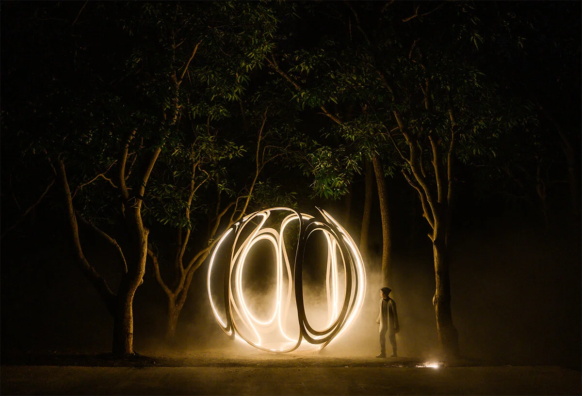 Artist Ling-Li Tseng describes her recent installation as “a whispering between human(s) and nature.” Debuted in Houli at the 2020 Taiwan Lantern Festival, “The Search of the Glow” is a lightweight, wooden sphere constructed with a series of connected ovals. Together, the pieces form a hollow orb that’s outfitted with thin strips of LED lights, creating a radiant installation that glows in the otherwise dim area.